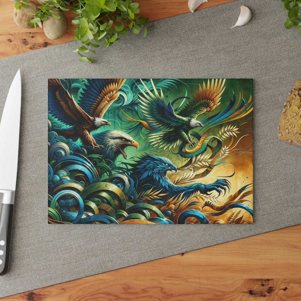 Jaguar Cutting Board With Tribal Graffiti Tempered Glass ArtMake food prep feel like a gallery experience with this jaguar cutting board. It isn’t just about cutting or serving snacks. It’s a modern surface that captures a jungle-inspired street art vibe through high-resolution jungle animal illustrations, swirling tribal elements, and sharp jewel tones. Layered on a green-blue gradient backdrop, it brings bold personality to your counter while offering durability that lasts beyond trends and seasons.Jaguar Cutting Board With Tribal Graffiti Tempered Glass ArtWhether you're slicing vegetables or layering your favorite meats and cheeses for an evening with friends, your setup deserves more than the usual dull, plain surface. This jaguar cutting board is crafted from tempered glass, ensuring strength for chopping while serving as a bold statement piece on any kitchen counter or party display. It comes alive with every cut thanks to its textured surface that resists slips and enhances control — making daily meal prep more practical and way less boring.This isn’t just another piece of kitchen gear. The graffiti animal design transforms your prep time into a creative experience. Its surface is scattered with jungle animals brought to life through tribal lines, layered patterns, and a paint-sprayed palette that shifts from green to blue. Pair it as an everyday board or toss it into your next party spread as a charquterie board centerpiece that stirs curiosity. You're not just chopping — you're showing off your style too.Animal Print Cutting Board With Urban Wildlife StyleFeeling like all your kitchen accessories look the same? This animal print cutting board changes that. It breaks away from minimalism and brings art directly into your kitchen. Lined with non-slip rubber feet and textured for better grip, this board stays steady through every cut. Tempered glass handles hot, cold, messy, or clean — without absorbing color or odor like plastic or wood. A quick hand wash and it's good to go again. Let it lean against your backsplash between uses so the design can live off-duty too.Charquterie Board That Doubles As A Statement PieceUsing it as a charquterie board? It's got range. Stack cheeses, fruits, freshly cut herbs, and meats for a burst of color laid over bold design. The wild theme naturally complements earthy spreads and exotic bites. Its two available sizes — small for casual nights in and large for entertaining guests — mean you can choose what suits your needs without breaking your theme or flow. It’s easy to move around without scratching or shifting, offering function wrapped in art. Available In Two Sizes 8" × 11" And 11" × 15" Tempered Glass Material With Textured Grip Surface High Resolution Graffiti Style Jungle Animal Artwork Non-Slip Rubber Feet Keep It Firm On Any Surface Ideal For Chopping Serving Or As Charquterie Board Resists Stains Odors And Knife Marks Easy Hand Wash For Long-Lasting Color And Clarity Green To Blue Gradient Background With Tribal Accents